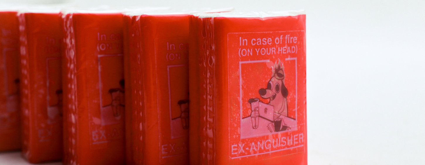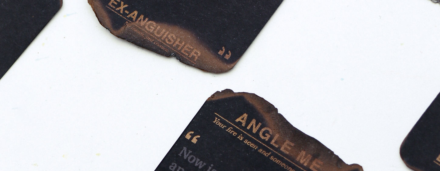 Each disguised fire extinguisher holds pocket tissues with hand-burned black cards. Tilted toward the light, each card reveals an anonymous message of survival—reminding students: someone made it through, and so can you.